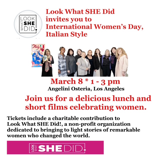 Guests will be treated to a delicious lunch, viewing of 3 short films from the Look What SHE Did! collection, and a signed copy of “100 Places in Italy Every Woman Should Go”–5th edition.