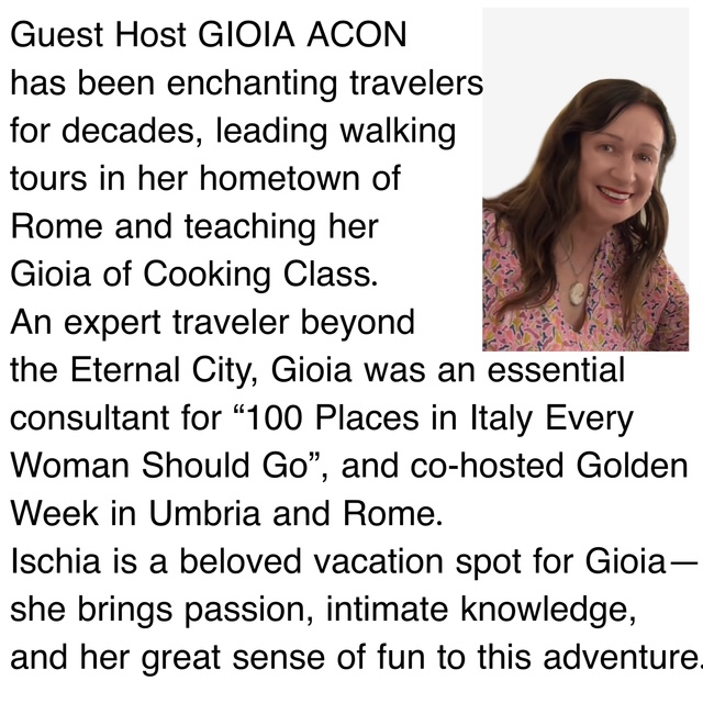 These Extra Golden Days are ideal to add on to an Italy itinerary–a chance to discover a gem many travelers miss, with insiders’ guidance. The 4-night itinerary is designed for a full immersion into authentic island pleasures, culture, and history. Mornings are on your own to indulge in Italian spa traditions or hiking adventures, and afternoon/evenings are group experiences, where with Host Gioia and wonderful women you’ll discover Ischia’s natural beauties, fascinating past, soulful spirit, and extraordinary food and wine.